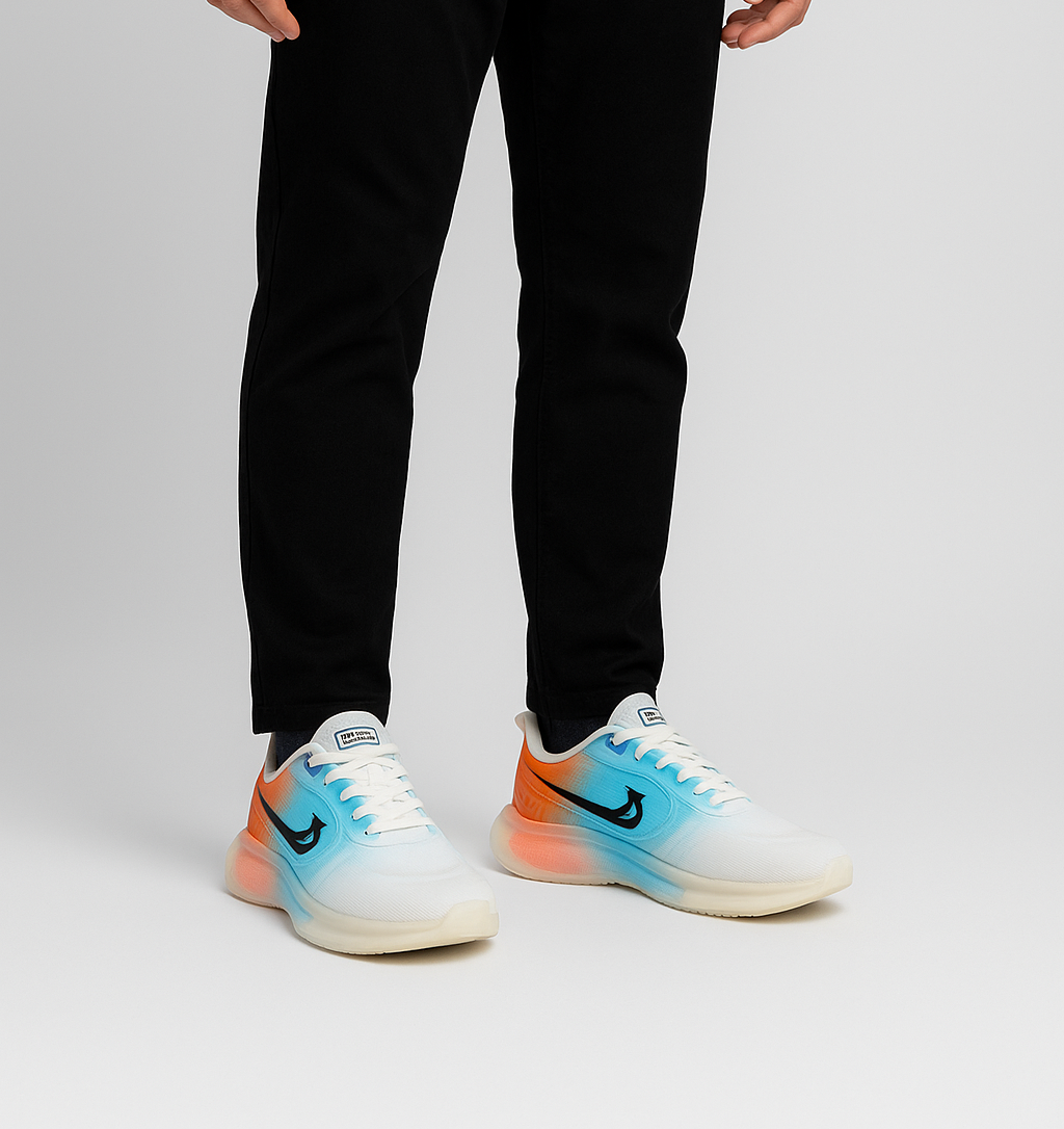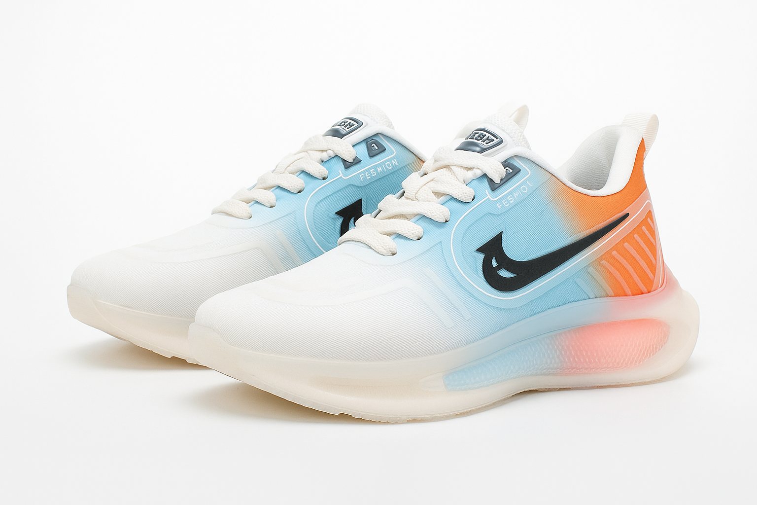 TrendTrendy gradient sneakers with a unique orange-to-blue fade design. Featuring a bold black side logo, breathable mesh upper, cushioned sole, and stylish light-reflective midsole. Perfect for casual wear, sports, and street fashion.y gradient sneakers with a unique orange-to-blue fade design. Featuring a bold black side logo, breathable mesh upper, cushioned sole, and stylish light-reflective midsole. Perfect for casual wear, sports, and street fashion.